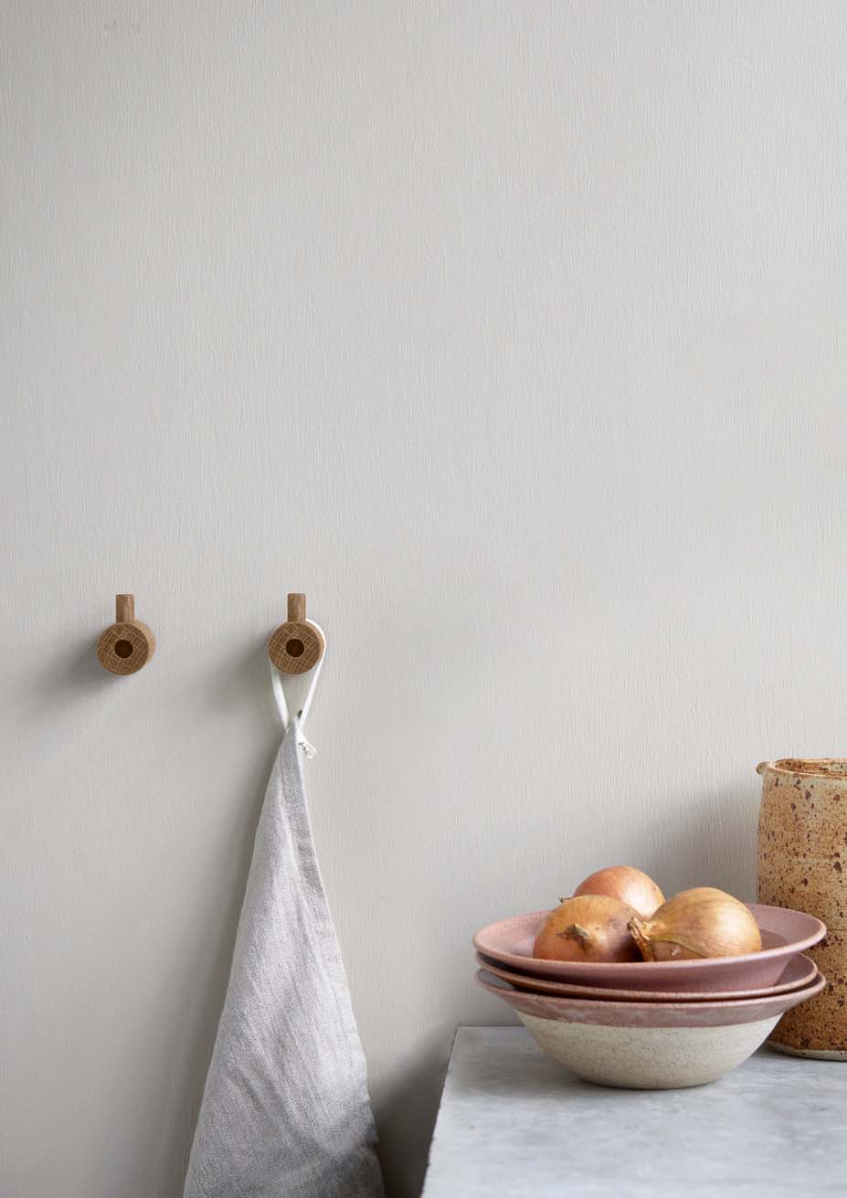 De houten wandhaak bestaat uit twee stukken massief eikenhout. Het grootste deel wordt aan de muur bevestigd. Het tweede en kleinere deel wordt van bovenaf in het eerste deel geschoven. Hierdoor wordt de schroef waarmee het eerste deel aan de muur bevestigd is verborgen. De muurhaak kan worden gebruikt als één enkele haak maar is ook mooi in een reeks naast elkaar geplaatste haken.