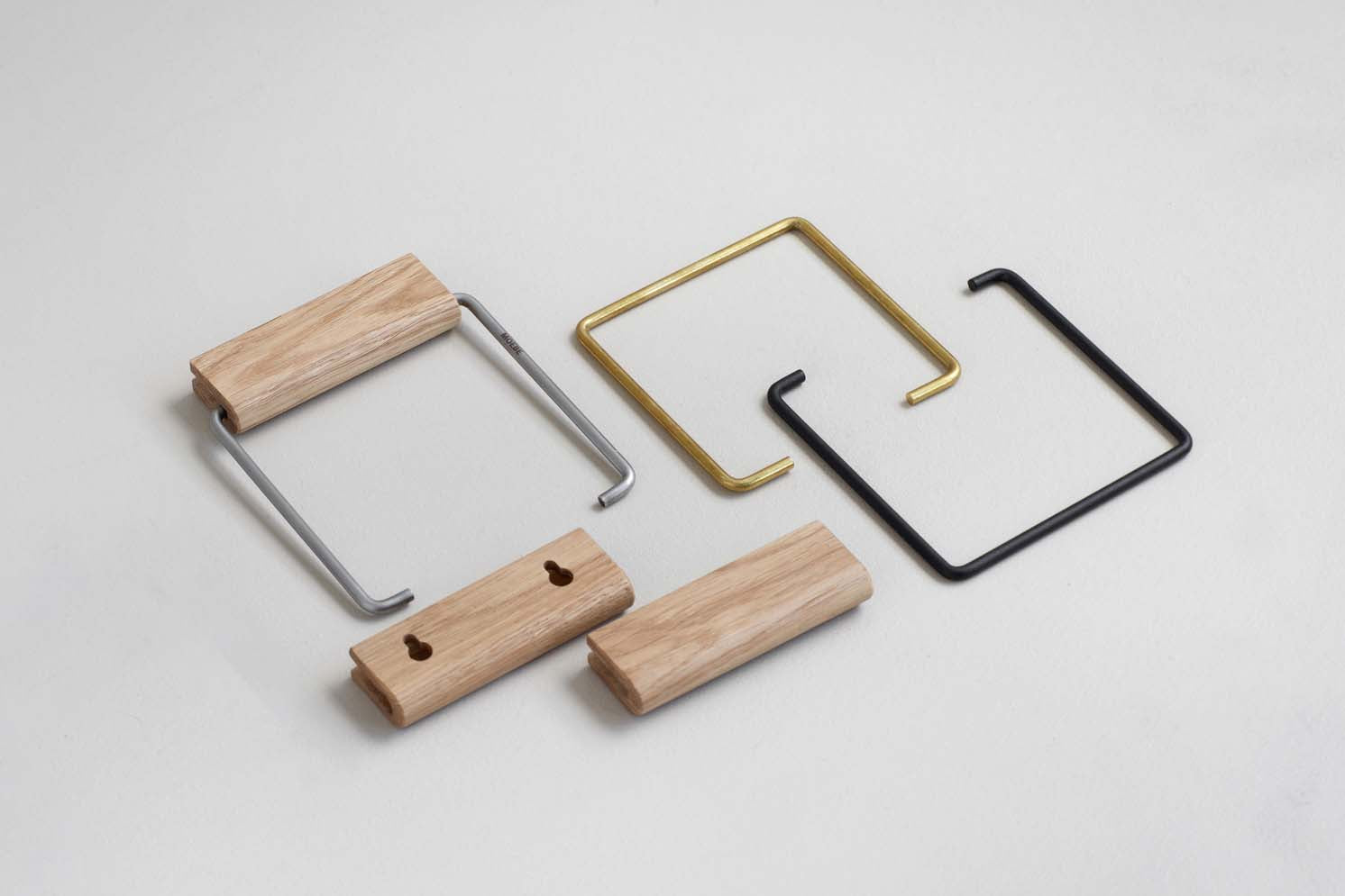De MOEBE-toiletrolhouder is gevormd uit twee delen. De metalen draad houdt het papier op zijn plaats terwijl de houten beugel aan de muur wordt bevestigd. Om de toiletrolhouder in een vochtige ruimte te kunnen gebruiken is het eikenhout behandeld met lak. De lak is overigens op waterbasis.